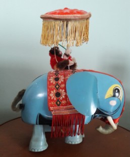 Op batterij werkende blikken olifant met draaiende parasol. Parasol gerepareerd.